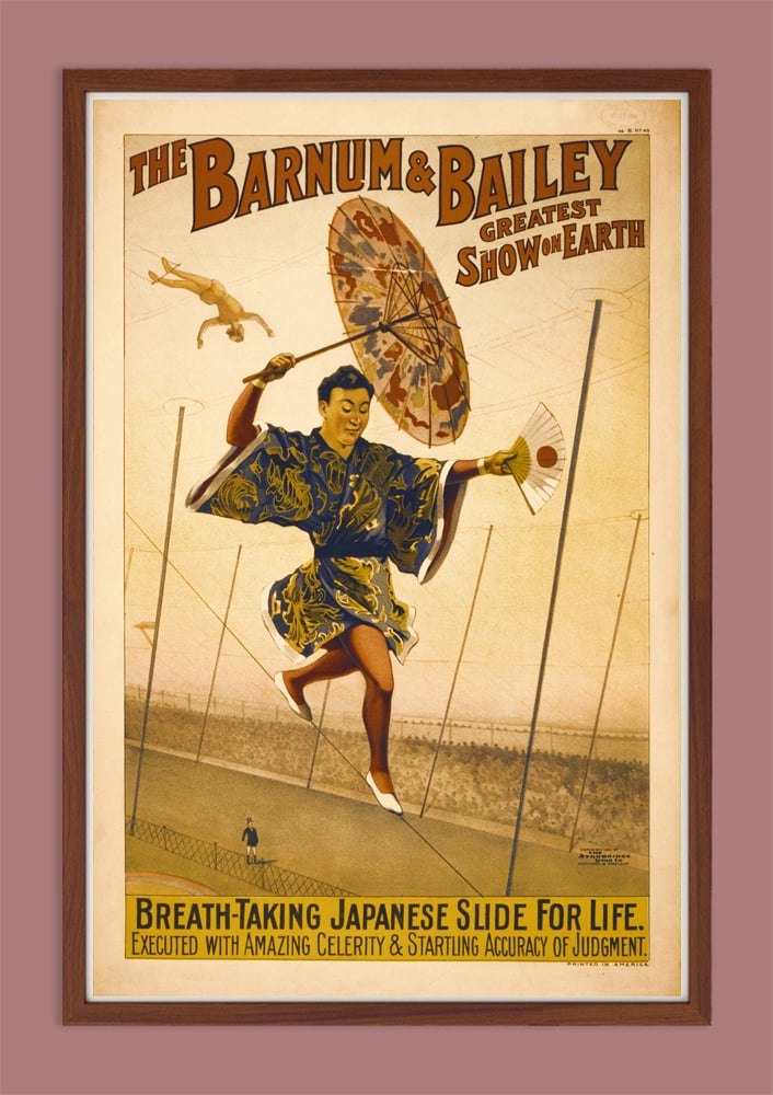 poster „The Barnum & Bailey Greatest Show on Earth - Breath-taking Japanese slide for life“, showing a Japanese tight-rope walker descending a steeply angled wire, was made in 1898.