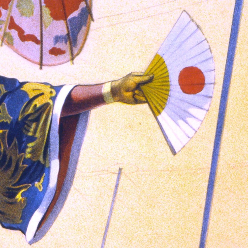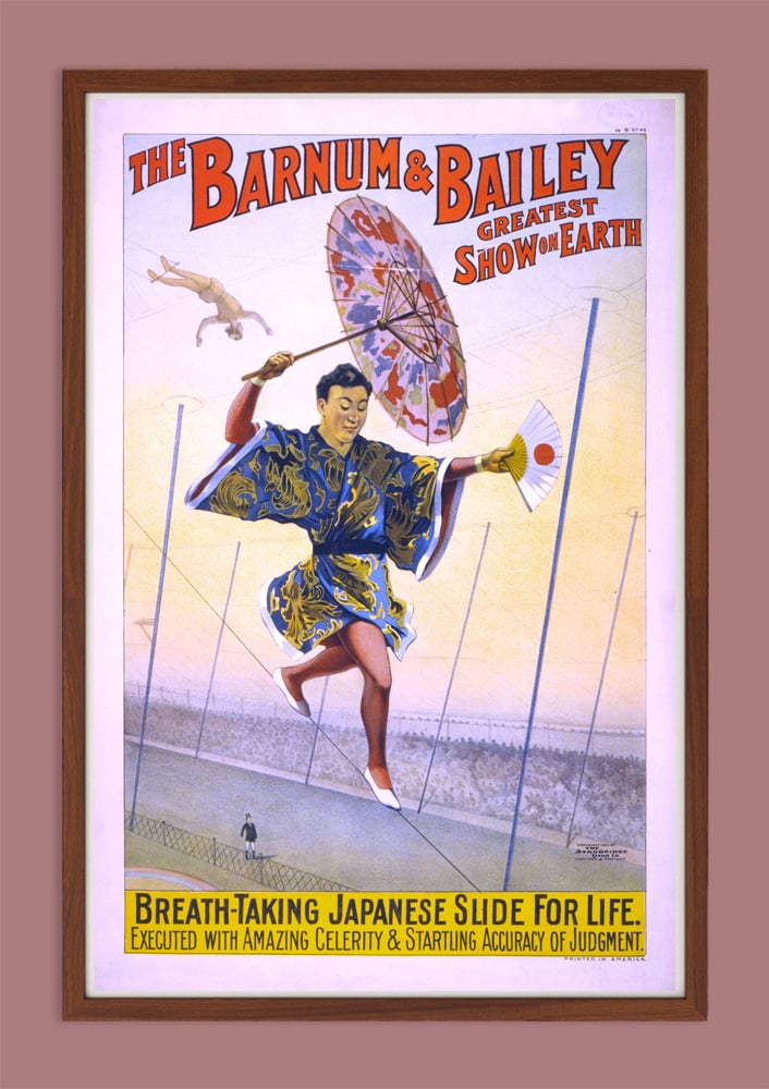 poster „The Barnum & Bailey Greatest Show on Earth - Breath-taking Japanese slide for life“, showing a Japanese tight-rope walker descending a steeply angled wire, was made in 1898.